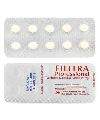 - Filitra Professional wird zur Behandlung von Erektionsstörungen eingesetzt. Das Medikament wirkt als selektiver Hemmer von Phosphodiesterase Typ 5 (PDE5), wodurch die Blutzufuhr zum Penis erhöht wird.